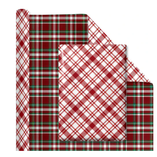 30" x 10’ Holiday Reversible Wrapping Paper | Red, Black and White Plaid/Red/White Plaid
