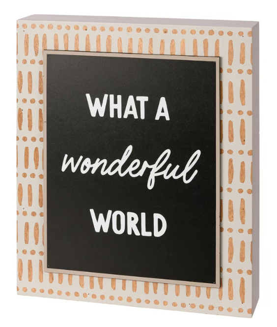 A wooden box sign from our Bohemian Collection features "What A Wonderful World" sentiment on a wooden pop with cream pop screen... Read more