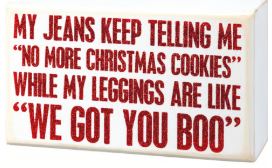A white wooden box sign featuring a glittery red "My Jeans Keep Telling Me 'No More Christmas Cookies' While My... Read more