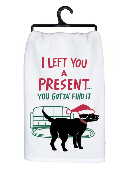A white cotton kitchen towel displaying unique hand illustrated designs of a dog wearing a Santa hat in a living... Read more