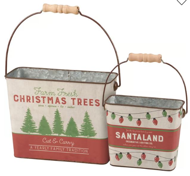Assorted galvanized metal buckets in different sizes from our Christmas Collection. Each holiday bucket displays vintage Christmas themed designs. Larger bucket displays a "Farm Fresh Christmas Trees" sentiment with a coordinating Christmas tree farm design. Smaller bucket displays a "Santaland" decorative lighting company inspired design. Holiday buckets are perfect for displaying seasonal greenery or décor. Accessories and greenery pictured not included. Our Santaland buckets have metal handles with wooden grips for easy carrying and stack inside each other for compact storage.