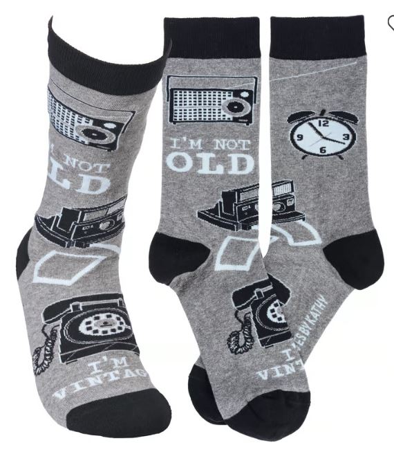 These colorful socks feature woven designs with coordinating "I'm Not Old I'm Vintage" sentiment. Cotton, nylon, spandex. One size fits... Read more