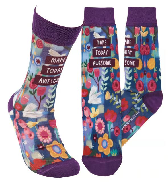 A pair of colorful socks from our Inspiration & Blooms Collection displaying a full-color design of abstract florals with an inspirational sentiment that reads "Make Today Awesome." Floral design is digitally printed replicating original hand illustrated artwork with purple color accents on the cuff, heel, and toe. These giftable socks are made with a spandex blend for a one size fits most design. Our Make Today Awesome socks come with a decorative header card and a clear plastic hanger for easy rack display and gifting. An inspirational gift perfect for everyday self-expression.