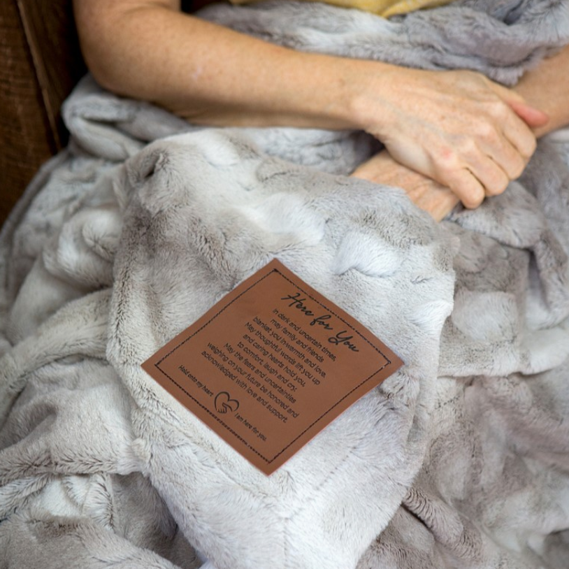Our "Softly Said" Here for You, comfort blanket measures 50"x65" and is overflowing with warmth and comfort. The faux fur and micro mink gray-toned blanket is an absolute gift for mind, body, and soul. A loving message is embossed on a faux leather label and sewn on the blanket for the recipient to remember your message each time it is used. The gift is packaged with a large grosgrain ribbon and gift tag. The gift tag includes a card to share your personal message. This a beautiful and thoughtful gift for a loved one or friend who is experiencing hard times, whether battling an illness, loss, life change, or other life hardship. The "Here for You" message and blanket will remind them that they are not alone. A perfect size to use on a bed or couch to cuddle or use when reading, watching TV or sleeping. Neutral colors suit many home decor styles and are an appreciated gift for older child, women, or men. 100% polyester, warm water wash, tumble dry low, no iron or bleach.