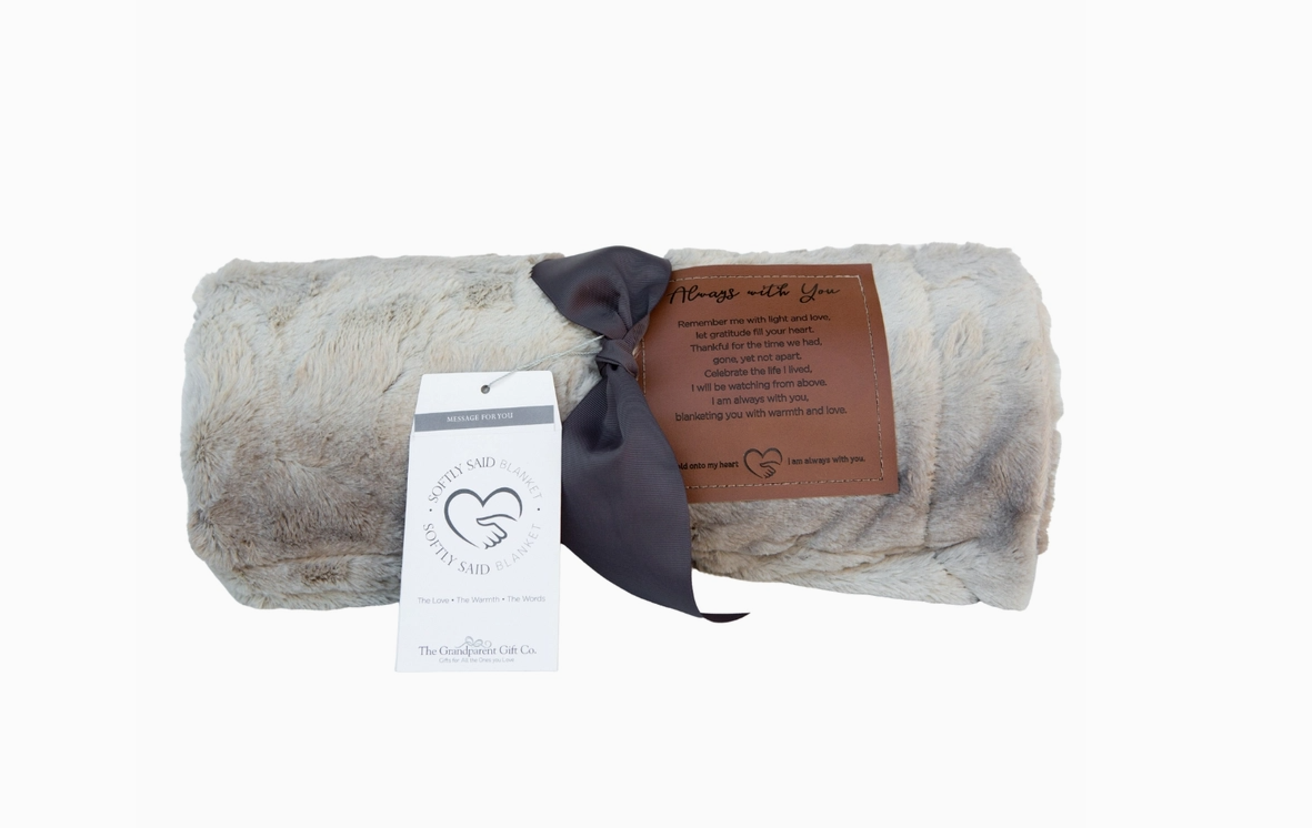 Our Softly Said Always with You, comforting memorial blanket measures 50"x65" and is overflowing with warmth and comfort. The faux fur and micro mink gray-toned blanket is an absolute gift for mind, body, and soul. A loving message is embossed on a faux leather label and sewn on the blanket for the recipient to remember your message each time it is used. The gift is packaged with a large grosgrain ribbon and gift tag. A beautiful and thoughtful gift for a loved one who has suffered the loss of a loved one. A perfect size to use on a bed or couch to cuddle or use when reading, watching TV or sleeping. Neutral colors suit many home decor styles and are an appreciated gift for older children, women, or men. The love, the warmth, the words, the Always with You blanket is a hug for the body & spirit. You are heard, you are seen, and loved. 100% polyester, warm water wash, tumble dry low, no iron or bleach. Perfect for sympathy gift, memorial gift, celebration of life.